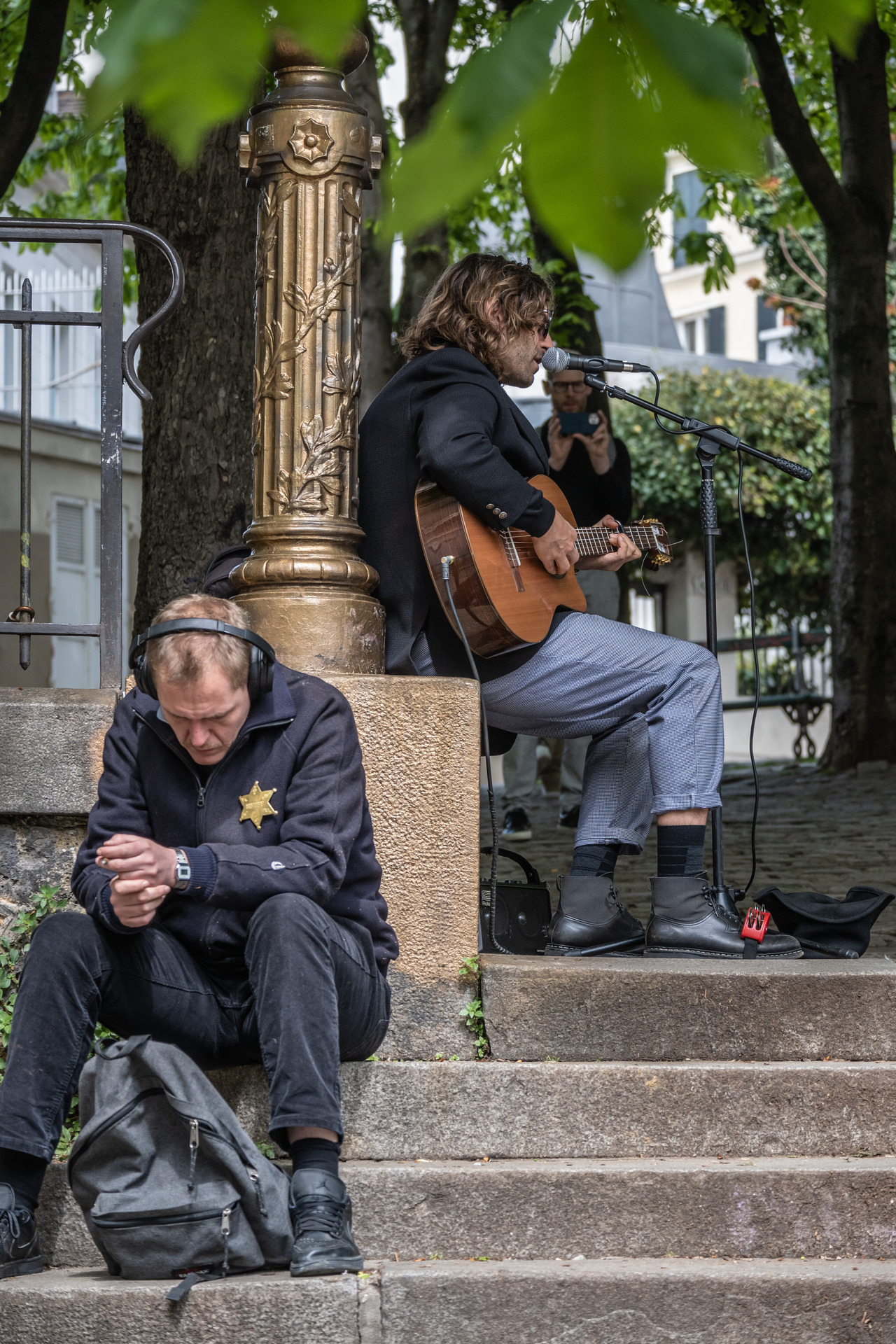 "Sheriffen" är helt inne i sin egen musikvärld men valde ändå att sätta sig precis där trubaduren satt och spelade. Kanske var det ryggstödet som lockade?