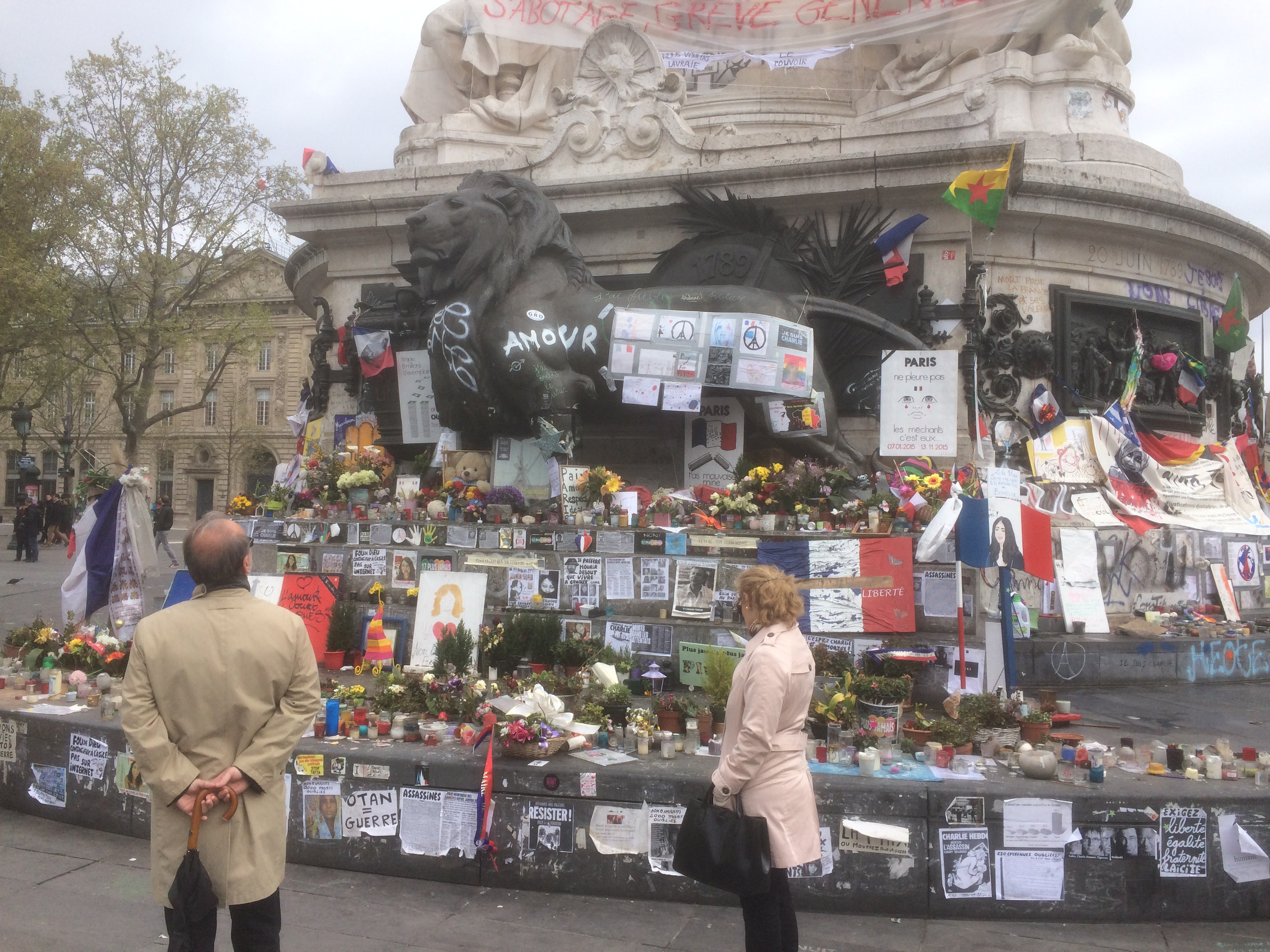Den 13 november 2015 drabbades Paris av flera synkroniserade terrordåd som resulterade i många dödade och skadade. När vi besökte Paris drygt 5 månader senare var spåren av händelserna mycket påtagliga. Så här såg det ut på Place de la République. Passerande stannade upp och stod en stund tysta och begrundande. En märklig känsla i den stora stadens, annars så hektiska, gatuliv.