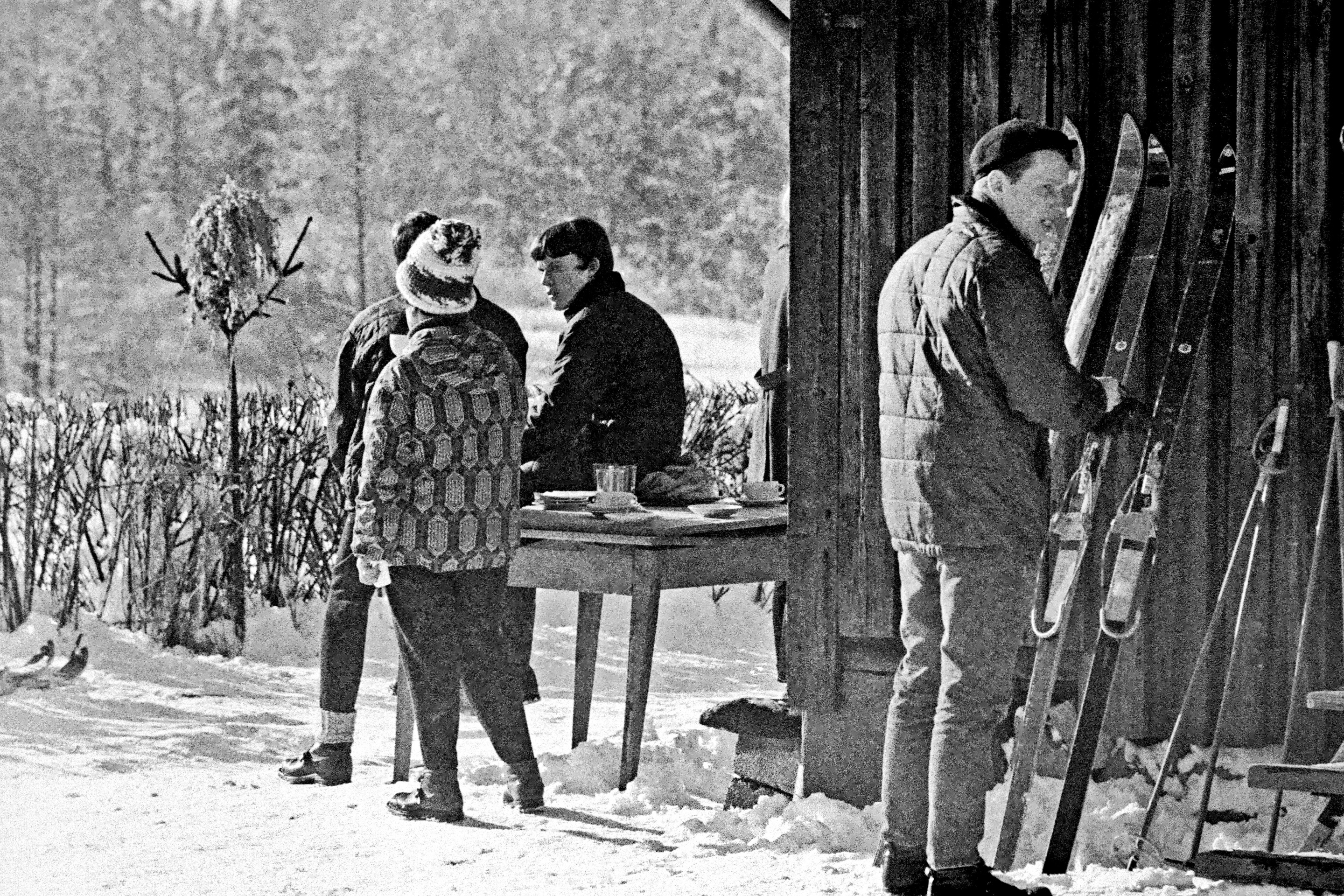 Fikapaus vid Bertilssons stuga efter en uppfriskande skidtur genom skogen. Skidor och bindningar av senaste modell. Stugan ägdes och drevs av kapten Bertilsson som alltid själv satt vid sitt bord och höll ett vakande öga på alla som kom in. Elektricitet saknades men en stor öppen spis gav en välkommen värme och torkade vantarna efter skidturen. På den tiden drack jag inte så mycket kaffe men ett stort glas varm saft satt fint. Stugan är än idag en populär rastplats med sitt fina läge vid Lilla Delsjön. Kapten Bertilsson är för länge sedan borta men hans porträtt sitter på väggen och numera har stugan både el och rinnande vatten. Ett besök rekommenderas om Du är i närheten.