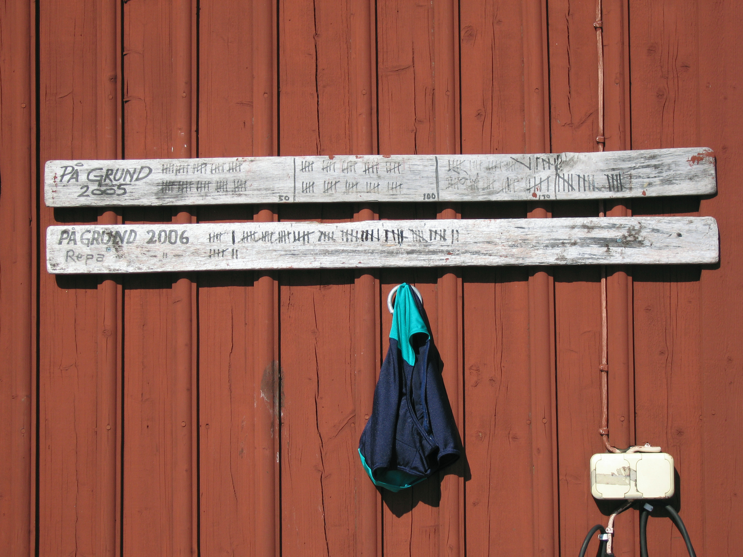 Mitt i hamninloppet till Väderö Storön fanns länge ett ej utmärkt grund. Alla frekventa besökare kände till det, i alla fall efter första besöket :-/ För egen del hade jag blivit förvarnad av vänliga ortsbor innan vi gjorde vårt första anlöp till Storöns hamn så jag har aldrig gått på det grundet. De som drev/driver värdshuset på ön roade sig med att sätta upp plankor på stugväggen nere vid bryggan (med fri sikt över hamninloppet och grundet ca 100 m bort). Hjälpsamma besökare ritade ett streck på årets planka för varje grundstötning de bevittnade, samtidigt som de njöt av sin öl. Som Du kan se av bilden blev det en ansenlig mängd dokumenterade grundstötninger.