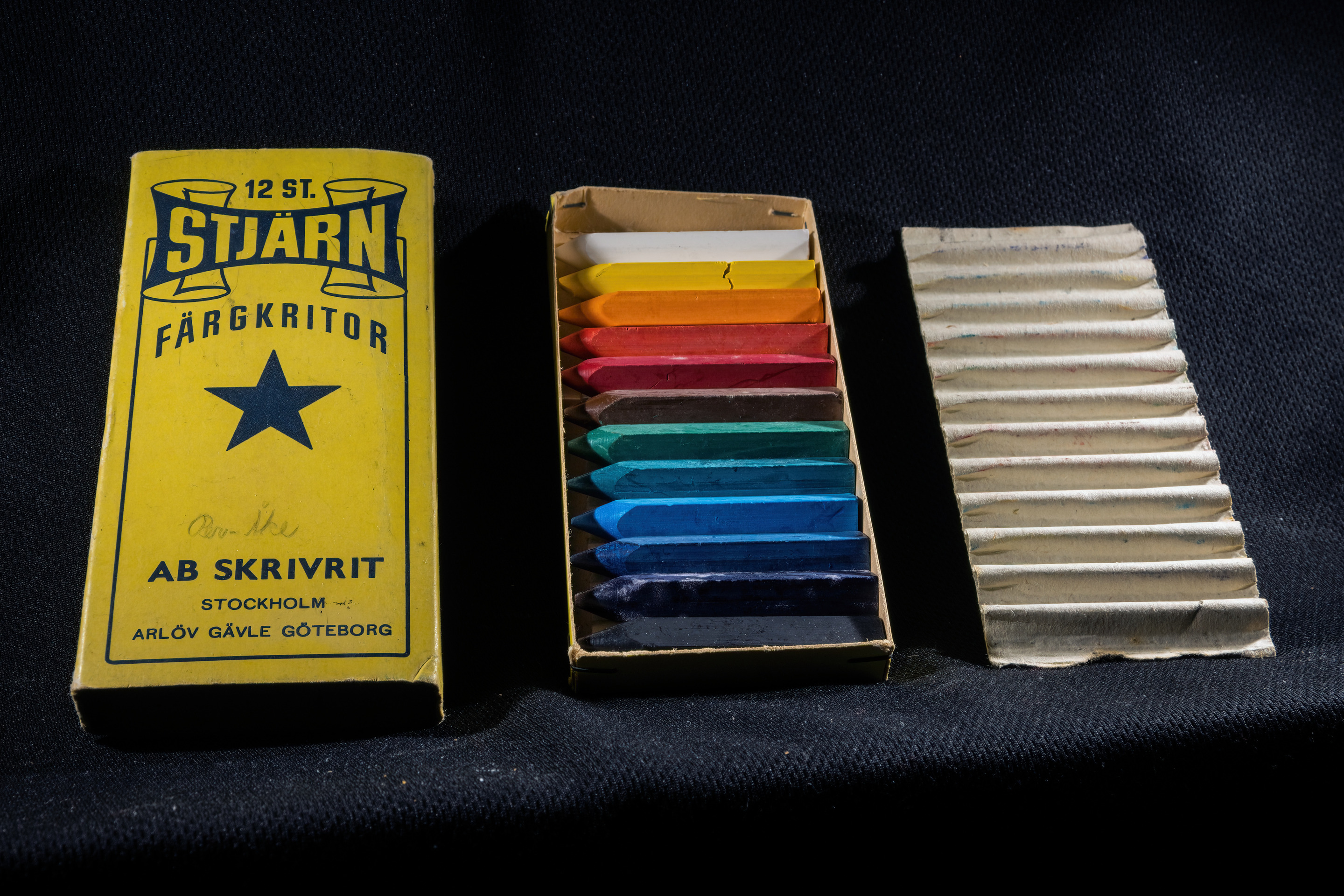 När jag gick i mellanstadiet (början av 60-talet) fick vi en ask kritor per läsår tror jag det var (möjligen en per termin). Eftersom jag var försiktig med mina kritor kunde jag använda kritorna längre än ett år och spara den nya asken. Asken på bilden har jag sparat sedan tredje eller fjärde klass. Kritorna är aldrig använda och ligger fortfarande i den ordning de låg när jag fick asken. Dessvärre har jag i något sammanhang lyckats knäcka den gula kritan :-(